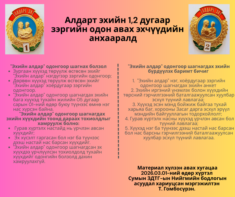 2.1.1.зургаан хүүхэд төрүүлж өсгөсөн эхийг "Эхийн алдар" нэгдүгээр зэргийн одонгоор;