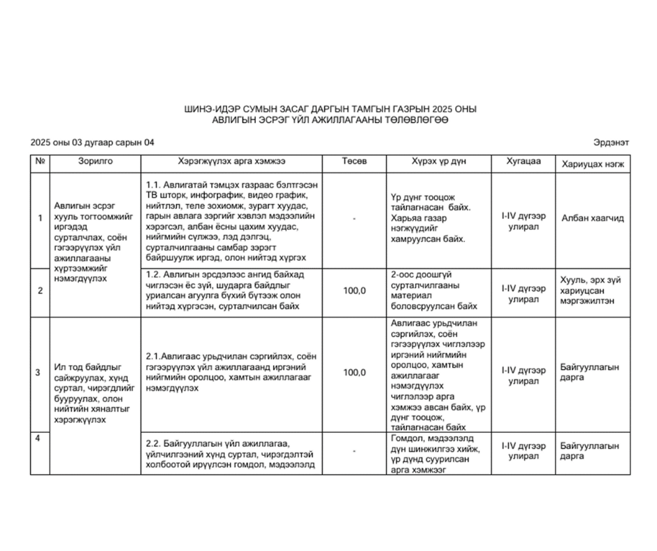 1.1. Авлигатай тэмцэх газраас бэлтгэсэн ТВ шторк, инфографик, видео график, нийтлэл, теле зохиомж, зурагт хуудас, гарын авлага зэргийг хэвлэл мэдээлийн хэрэгсэл, албан ёсны цахим хуудас, нийгмийн сүлжээ, лэд дэлгэц, сурталчилгааны самбар зэрэгт байршуулж иргэд, олон нийтэд хүргэх