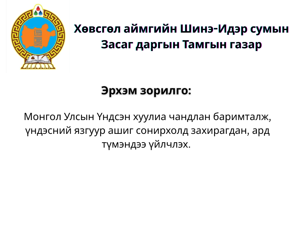 Монгол Улсын Үндсэн хуулиа чандлан баримталж, үндэсний язгуур ашиг сонирхолд захирагдан, ард түмэндээ үйлчлэх.